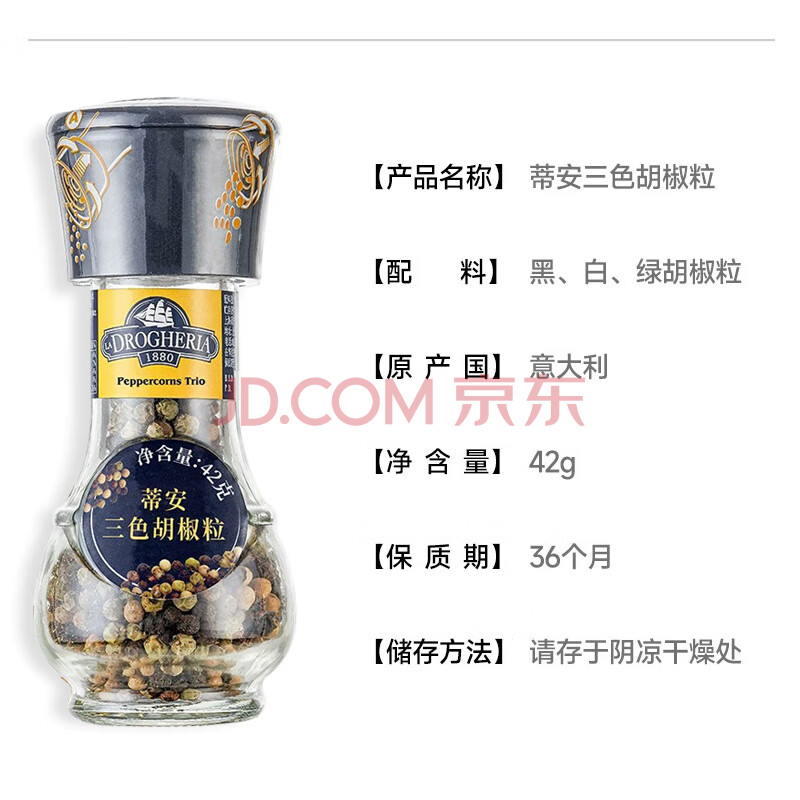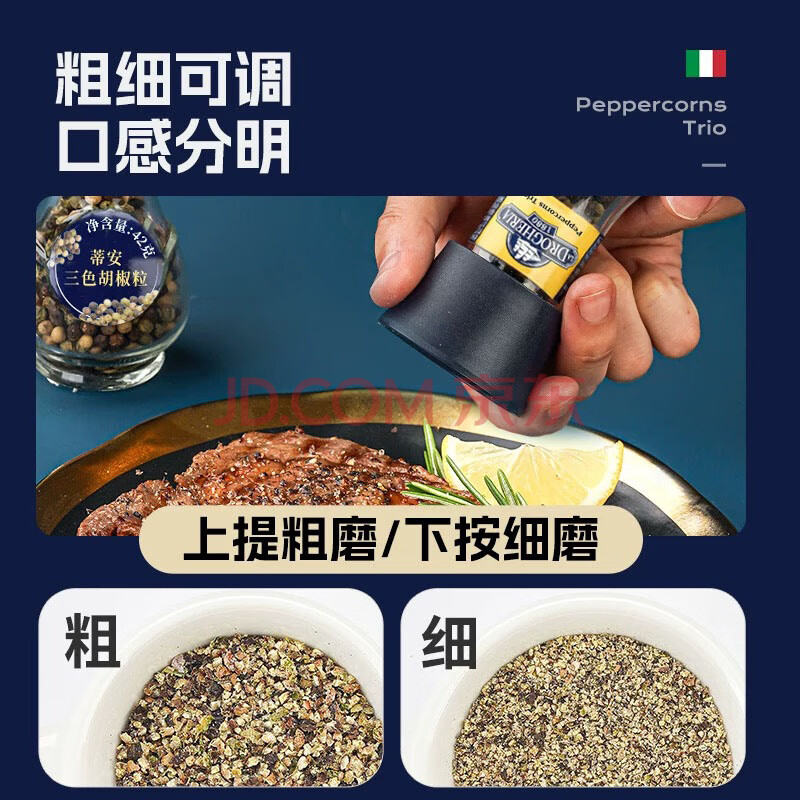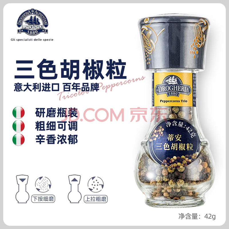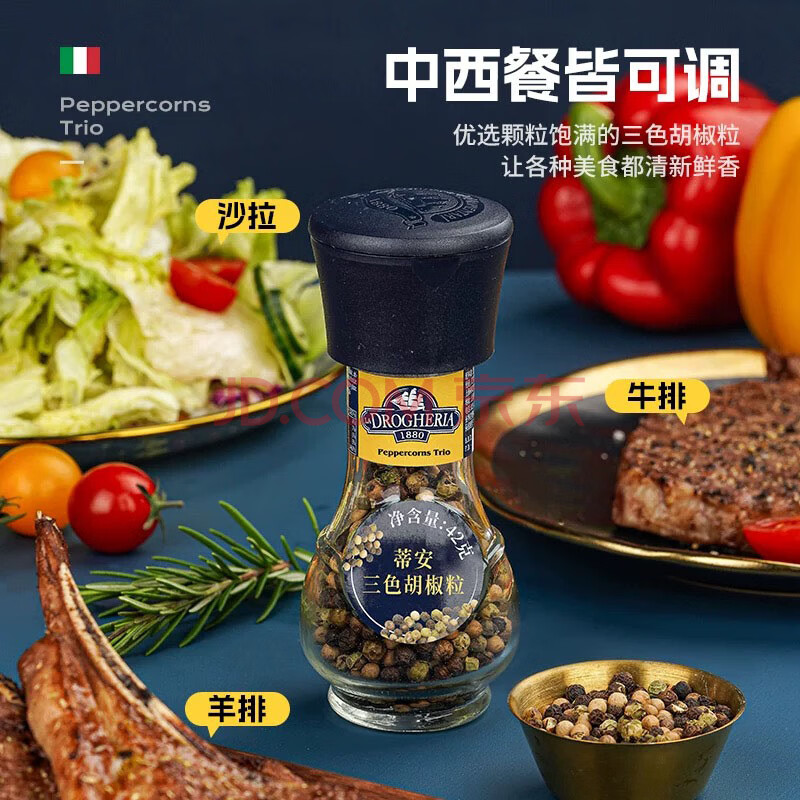 商品相册:蒂安D&A 意大利进口 三色多彩胡椒粒 研磨瓶装42g 黑胡椒西餐牛排意面第