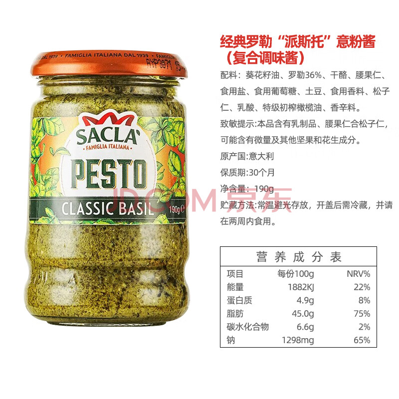 商品相册:萨克拉(Sacla)意大利进口 Pesto传统罗勒意粉酱(青酱)190g/瓶 披萨意面酱第