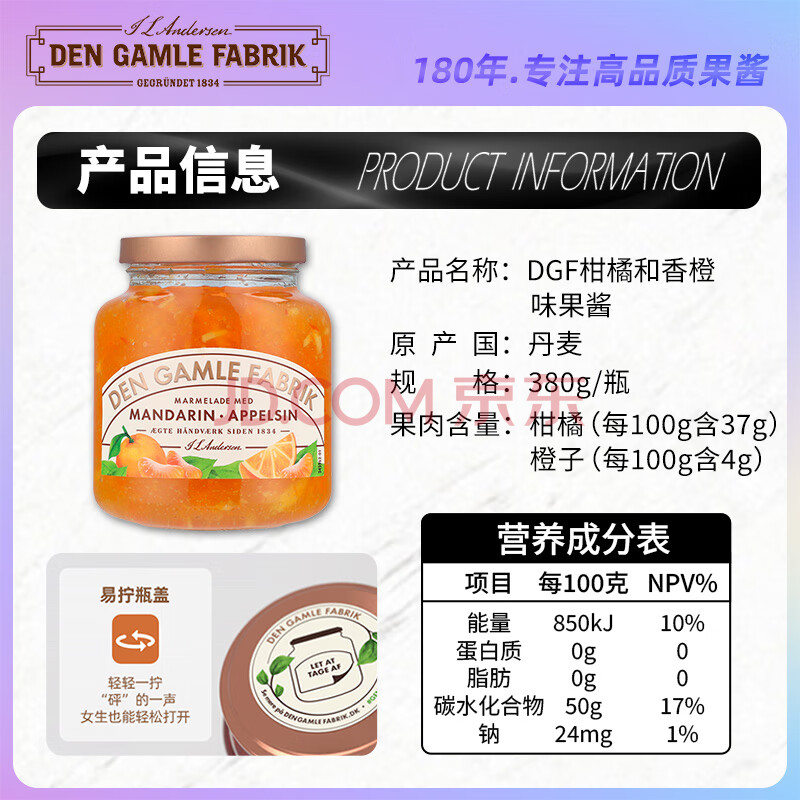 商品相册:DEN GAMLE FABRIK(DGF)丹麦进口 柑橘橙子混合果肉果酱380g面包搭档早餐伴侣0脂肪第
