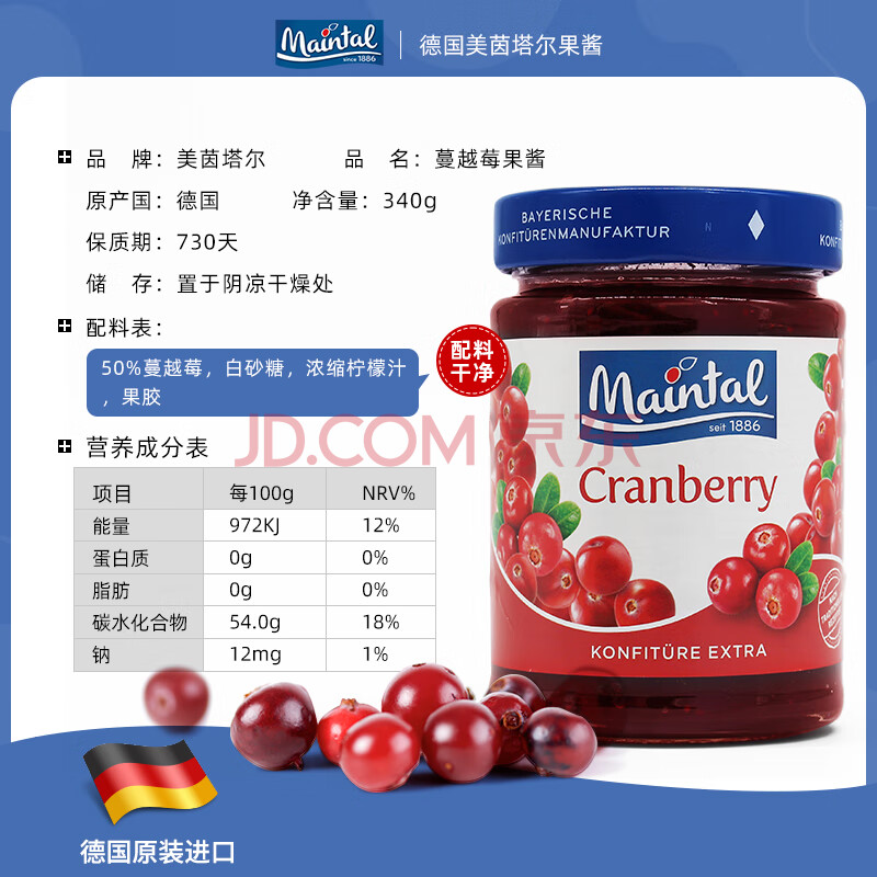 商品相册:美茵塔尔德国原装进口无添加蔓越莓酱340g早餐伴侣0脂肪第