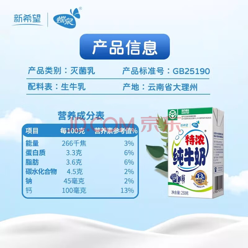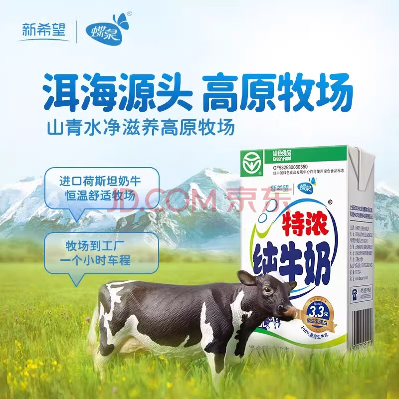 商品相册:蝶泉新希望特浓纯牛奶250g*24盒整箱 绿色食品3.3g原生乳蛋白 早餐奶第