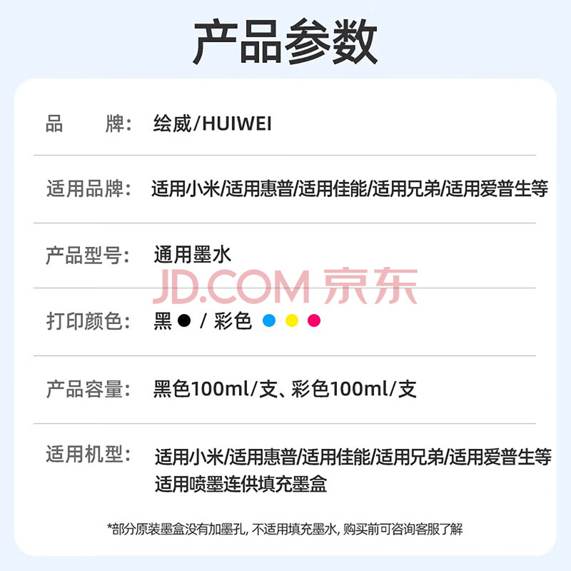 商品相册:绘威适用小米 惠普 佳能 爱普生喷墨打印机墨水 805 845 803 680 682 815 802墨盒填充墨水 100ml四色套装第