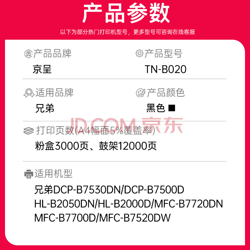 商品相册:京呈TN-B020墨粉盒 3支装适用兄弟DCP-B7535DW DCP-B7520DW B7530DN墨盒打印机第