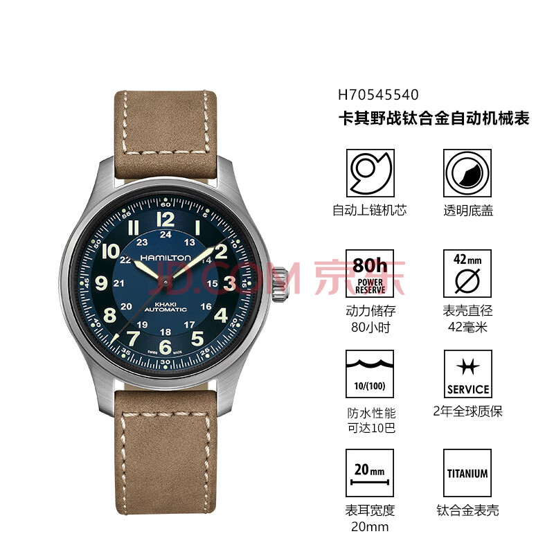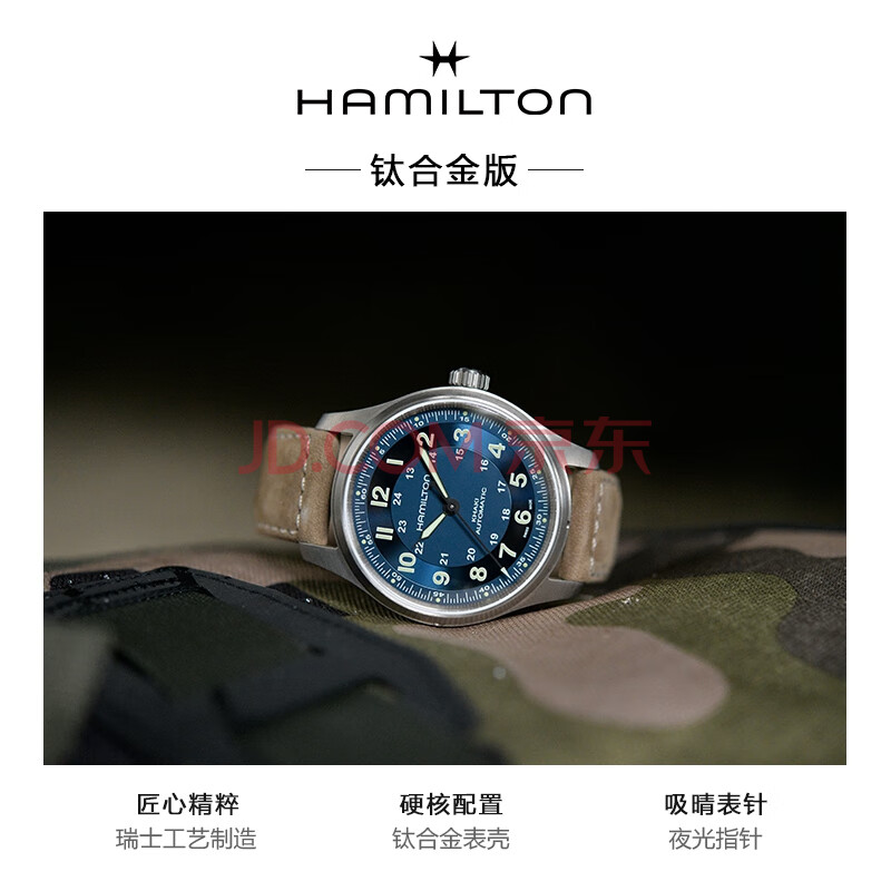 商品相册:汉米尔顿(Hamilton)汉密尔顿男款手表 卡其野战钛金属42蓝盘皮带瑞士手表机械表礼物第