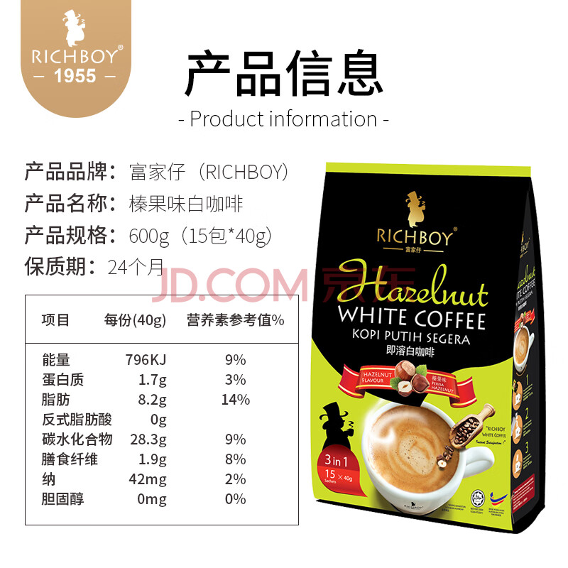商品相册:富家仔 原装进口榛果味白咖啡速溶600g 马来西亚大师级调配特香浓咖啡粉第