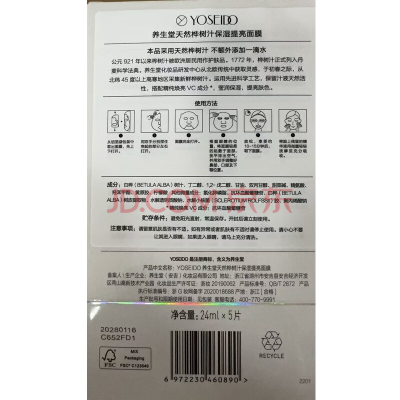 商品相册:养生堂天然桦树汁保湿提亮面膜5片 水润修护提亮暗沉肤色生日礼物送女生第