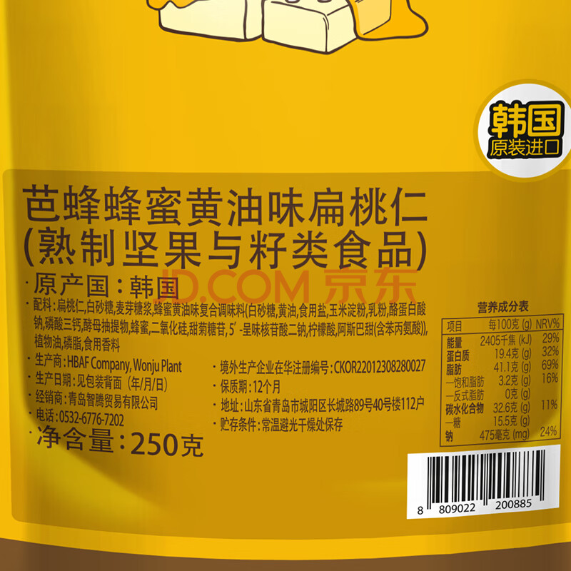 商品相册:芭蜂蜂蜜黄油扁桃仁250g 韩国进口汤姆农场干坚果巴旦木杏仁休闲零食第