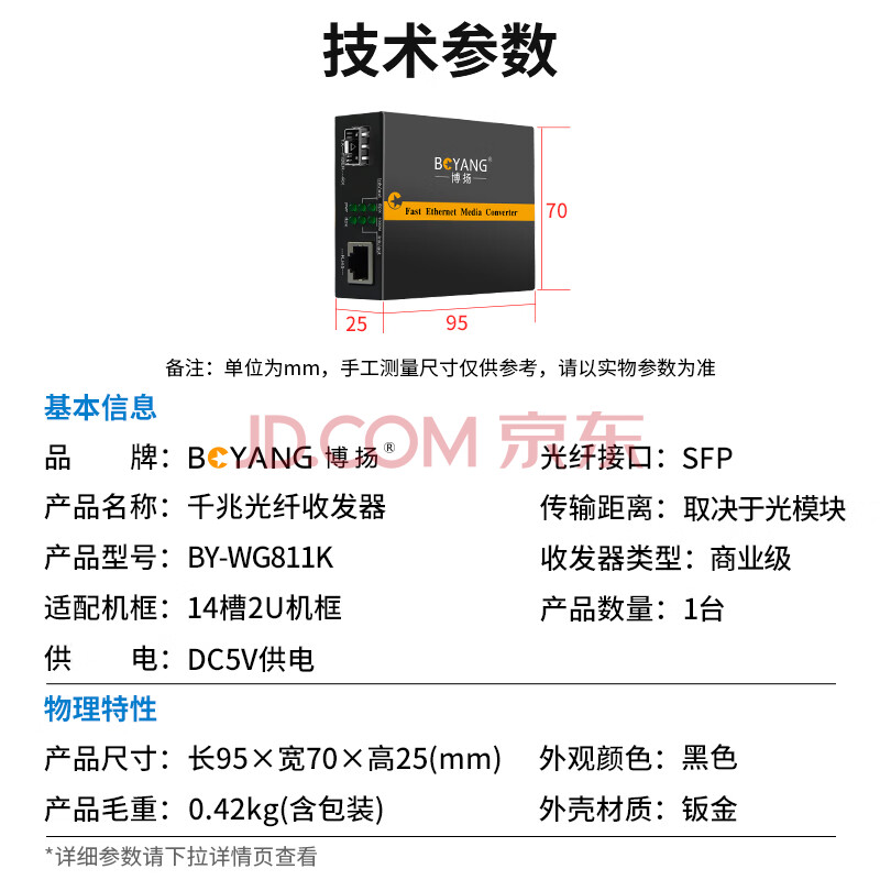 商品相册:博扬(BOYANG) 千兆SFP收发器 光电转换器 支持14槽机架 防雷防浪涌 SFP接口不含模块 外置电源一台 BY-WG811K第