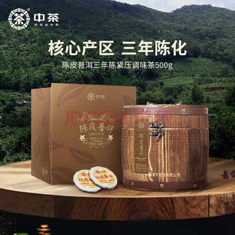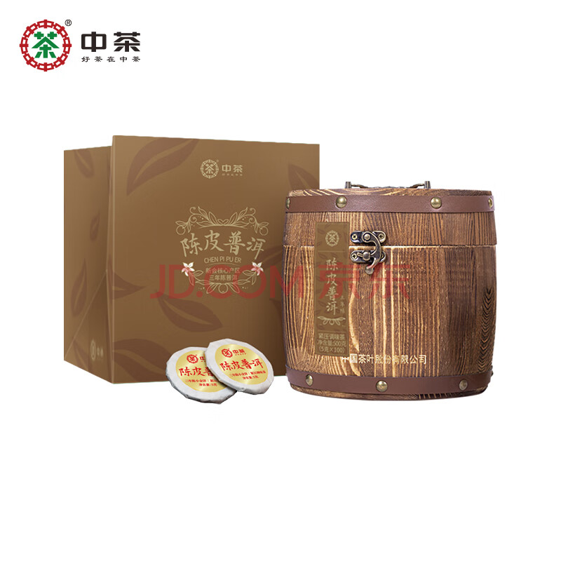 商品相册:中茶茶叶普洱茶陈皮普洱熟普云南普洱熟茶小金饼木桶装500g中华老字号第