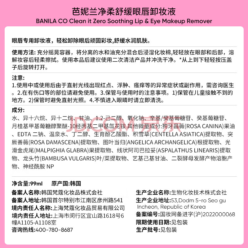 商品相册:芭妮兰(banila co)净柔舒缓眼唇卸妆液 99ml (植萃精油养肤配方 舒缓 保湿 便携)第