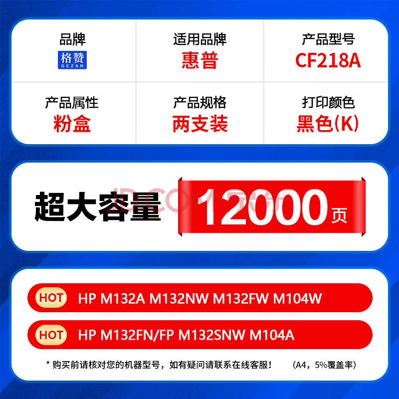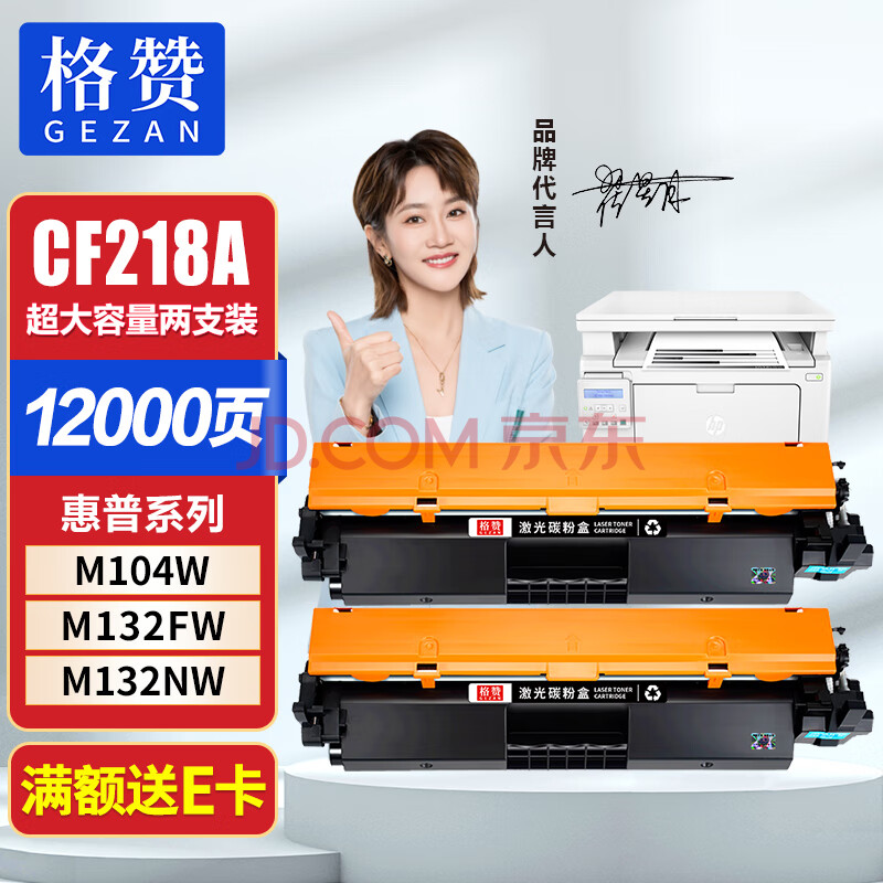 商品相册:格赞CF218A硒鼓适用惠普M132A M132NW 132FW打印机粉盒M132FN/FP M132SNW M104W M104A墨盒18A碳粉超大容量2支装第