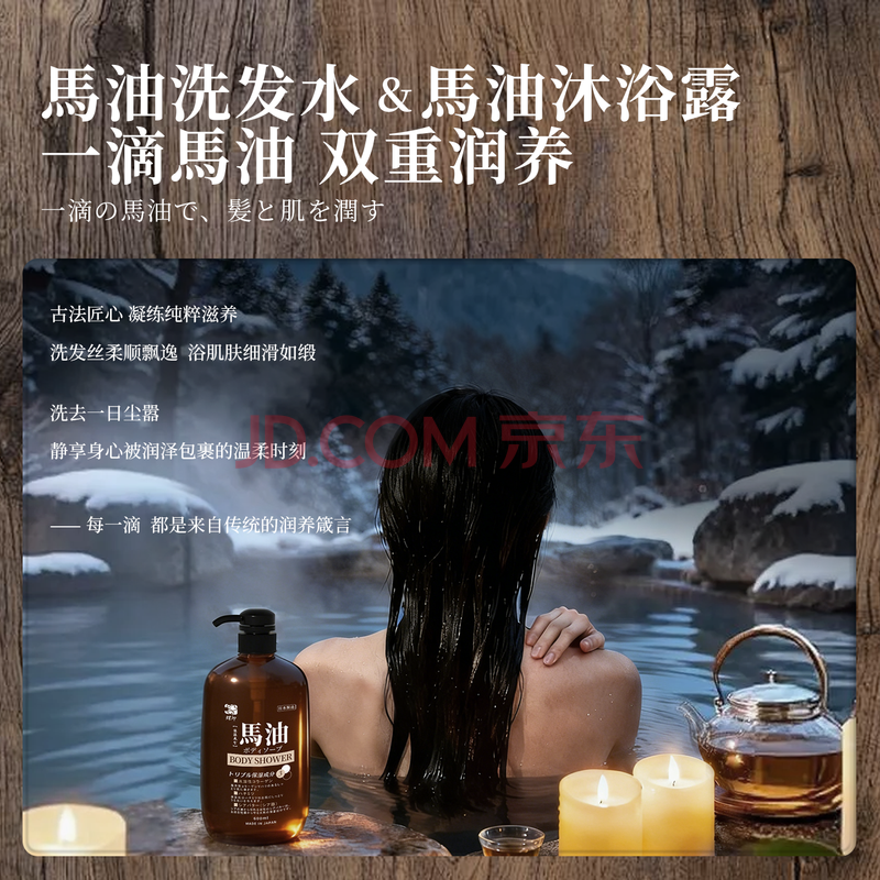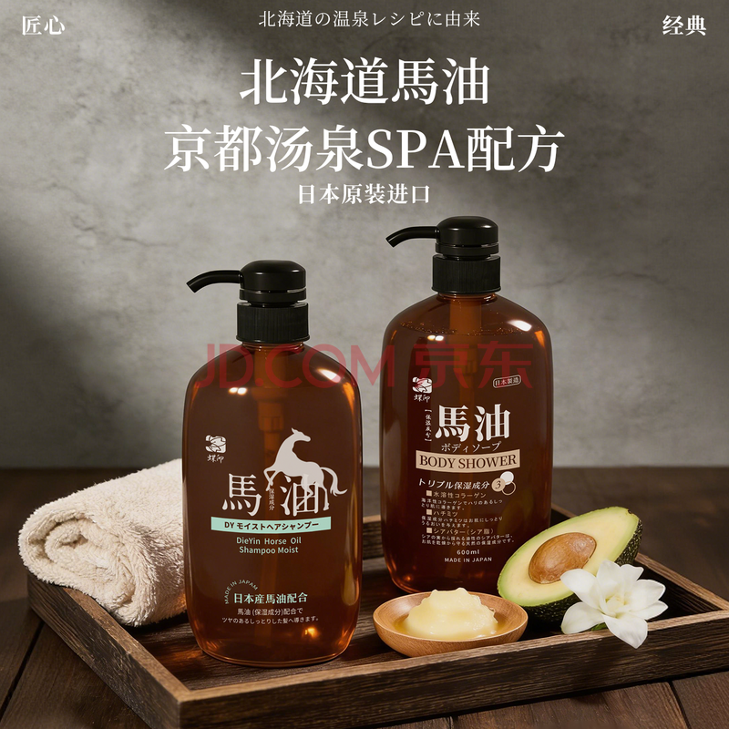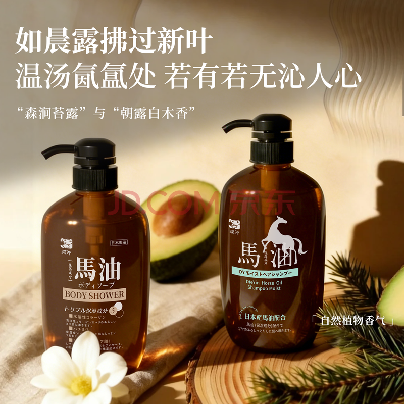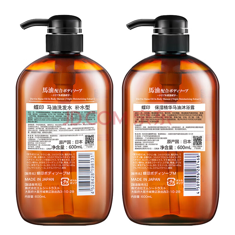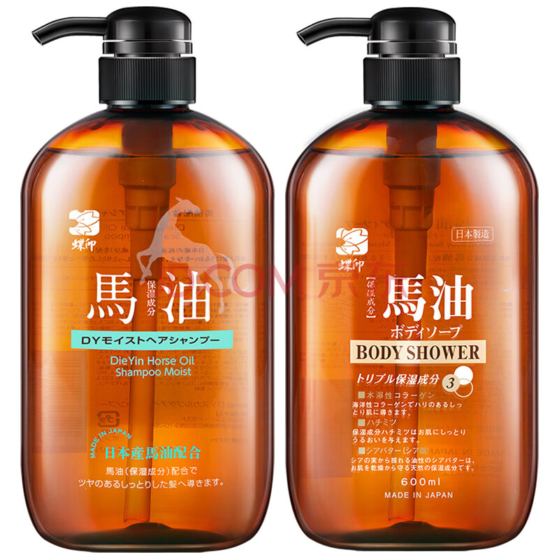 商品相册:蝶印 日本进口 马油洗沐套装(补水洗发水600ml+沐浴露600ml)礼盒装第