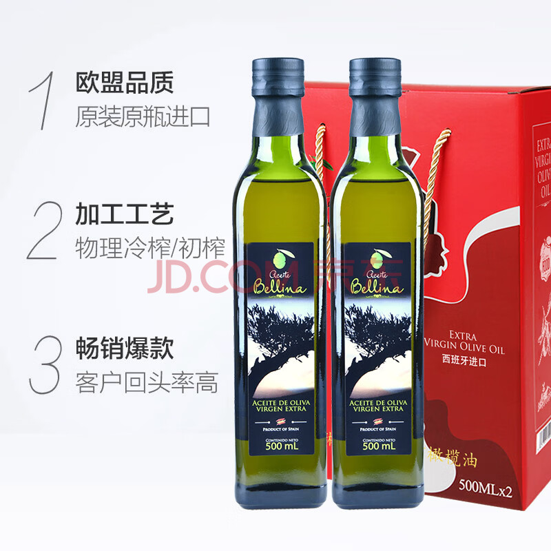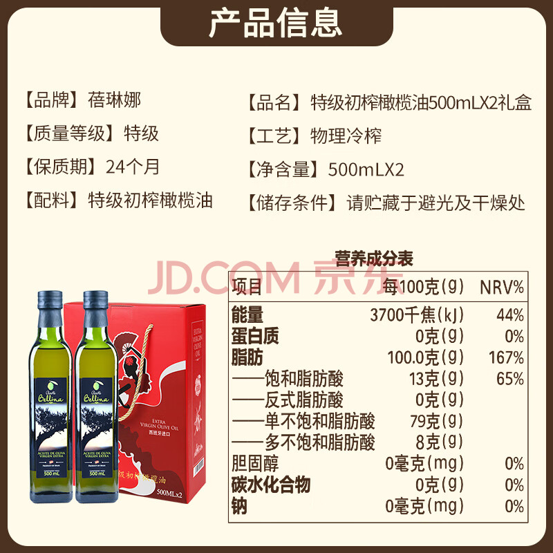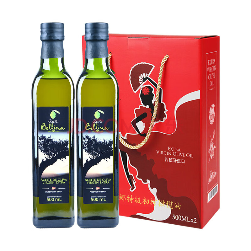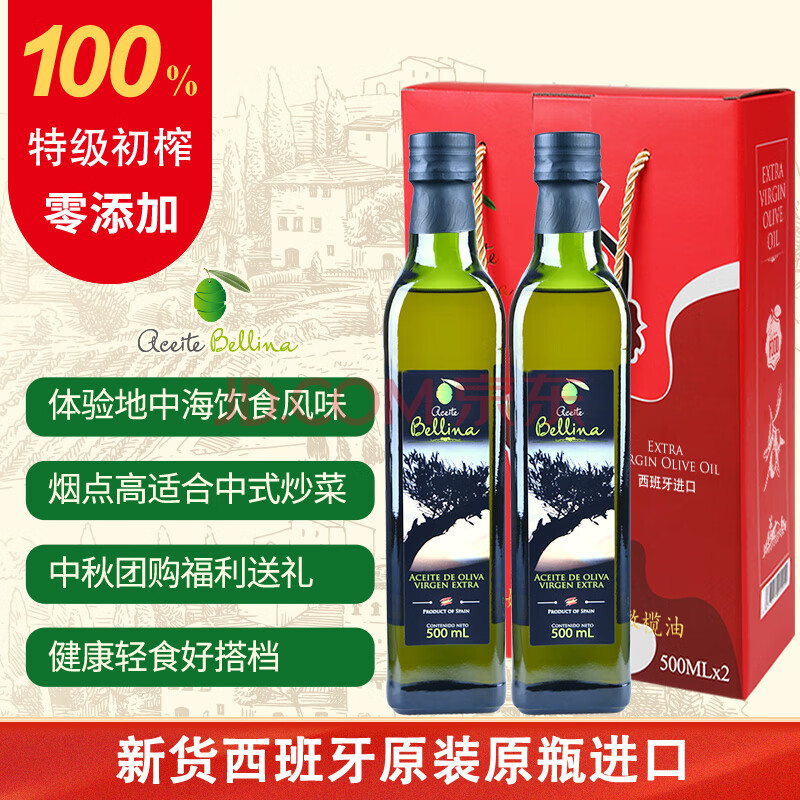 商品相册:蓓琳娜(BELLINA)【保真橄榄油】欧洲原装进口100%特级初榨橄榄油500ml*2礼盒团购第