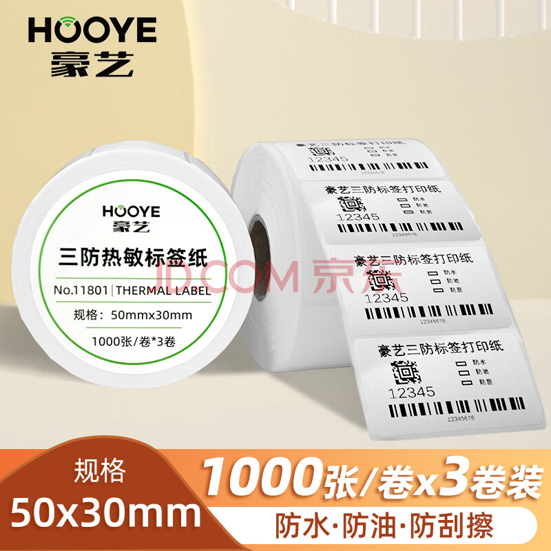 商品相册:豪艺(HOOYE)【品质甄选】三防热敏标签打印纸50×30mm 不干胶标签纸电子秤条码纸3卷 1000张/卷11801第