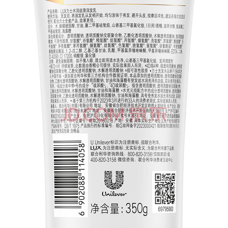 商品相册:力士(LUX)玻尿酸水润丝滑护发素350g 女士护发素润发精华 改善毛躁柔顺光泽第