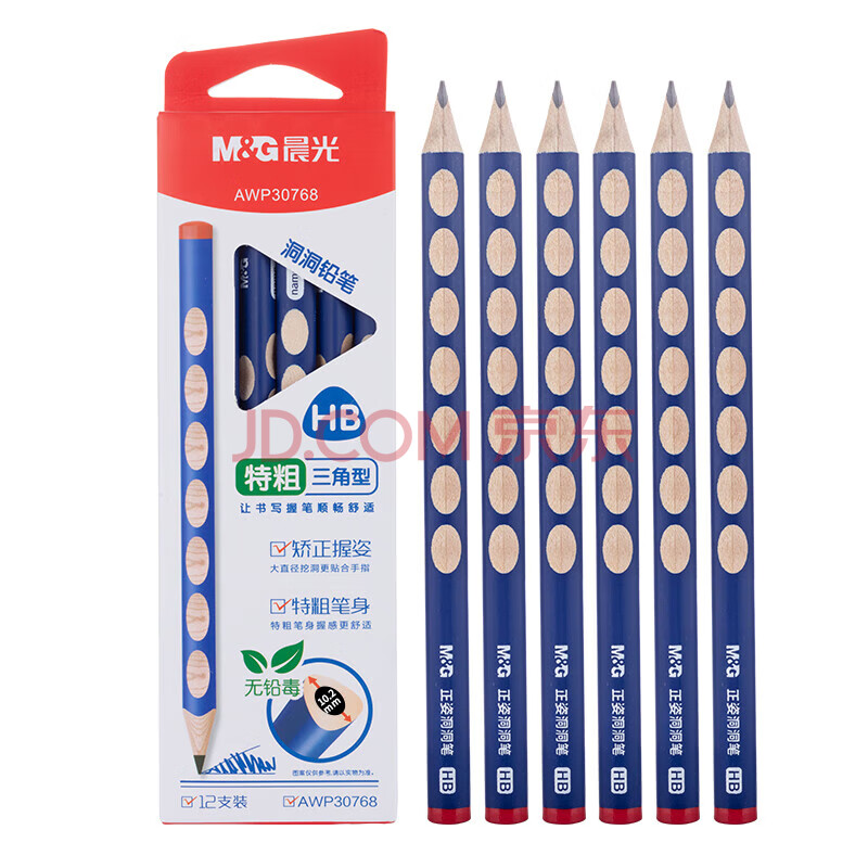 商品相册:晨光(M&G)文具 洞洞铅笔12支HB 特粗笔杆易抓握 儿童正姿矫姿开学练字书写 三角木杆铅笔蓝色款AWP30768第