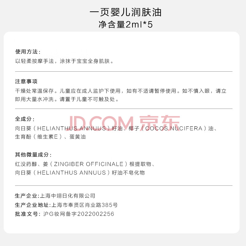 商品相册:一页婴儿抚触油新生儿润肤油滋润保湿宝宝按摩油2ml*5支次抛型第