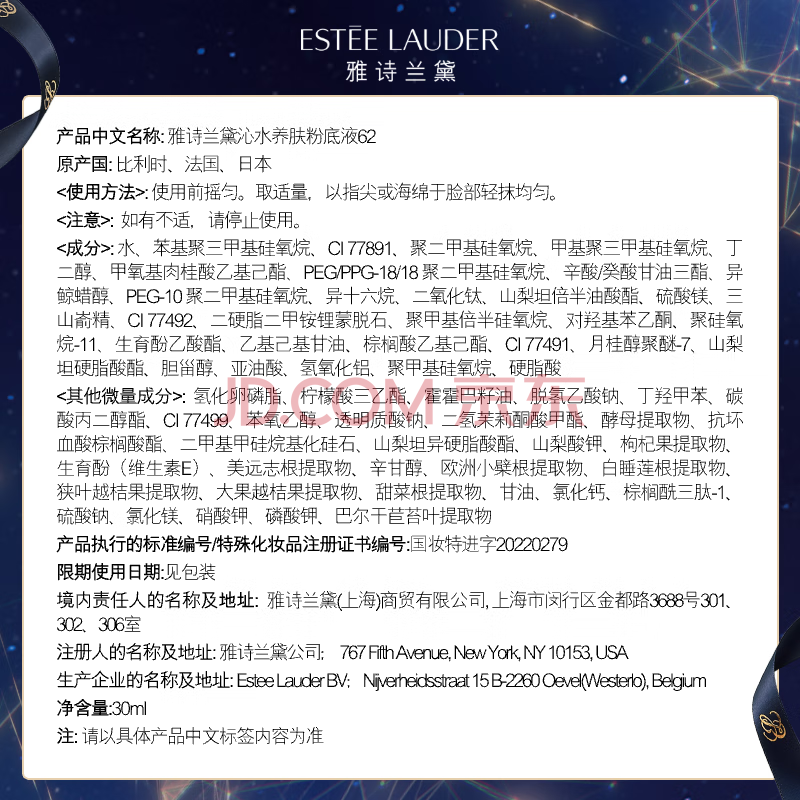 商品相册:雅诗兰黛沁水粉底液62#暖调瓷白(1W0)30ml干皮遮瑕化妆品礼盒生日礼物第
