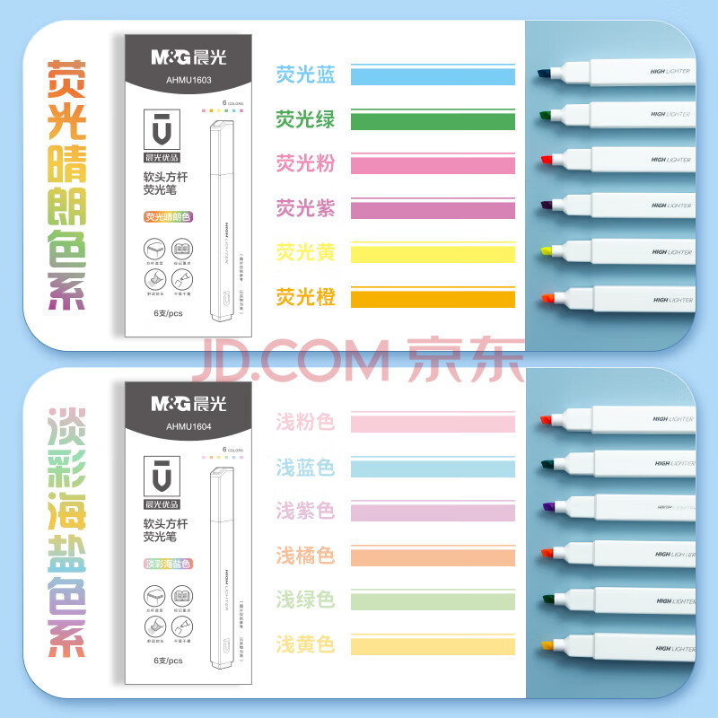 商品相册:晨光(M&G)文具6色方杆软头荧光笔 考试复习重点标记笔 彩色记号笔 荧光晴朗色手账笔 AHMU1603考试必备第