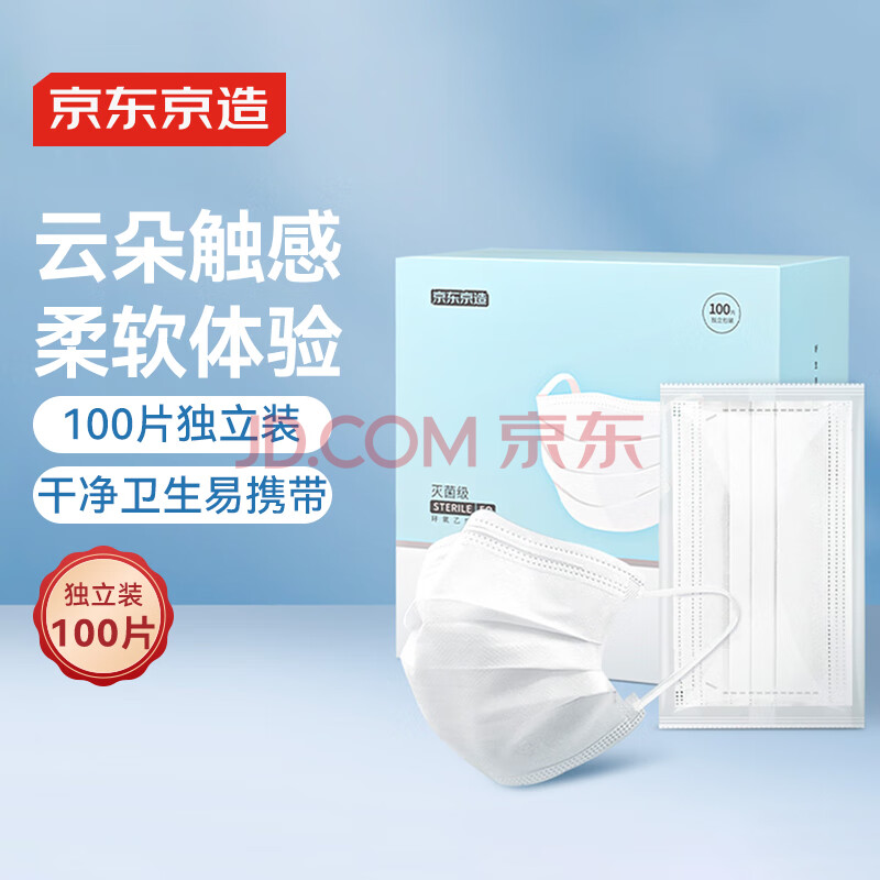 商品相册:京东京造医用口罩一次性独立包装灭菌级100只白色【超柔3倍舒适】防晒防尘第1张/共9