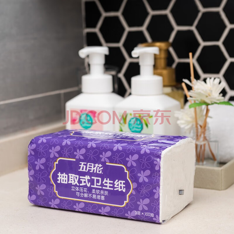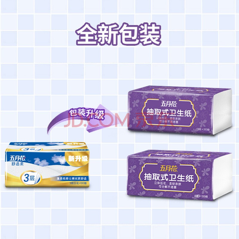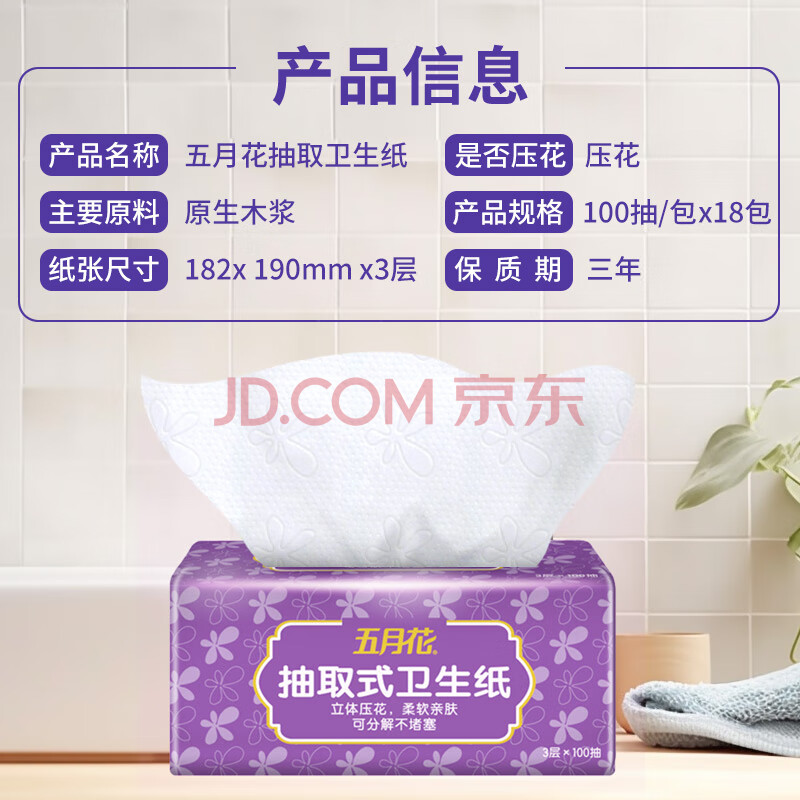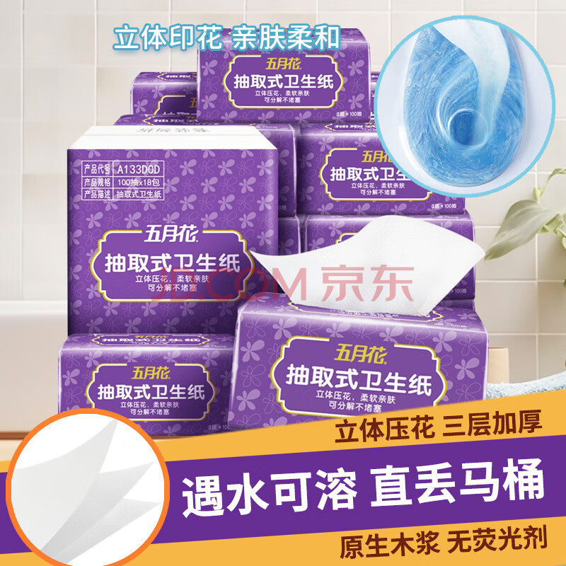 商品相册:五月花(May Flower)卫生纸 3层100抽*18包 抽取式厕所用纸 易溶水可冲马桶 整箱售卖第
