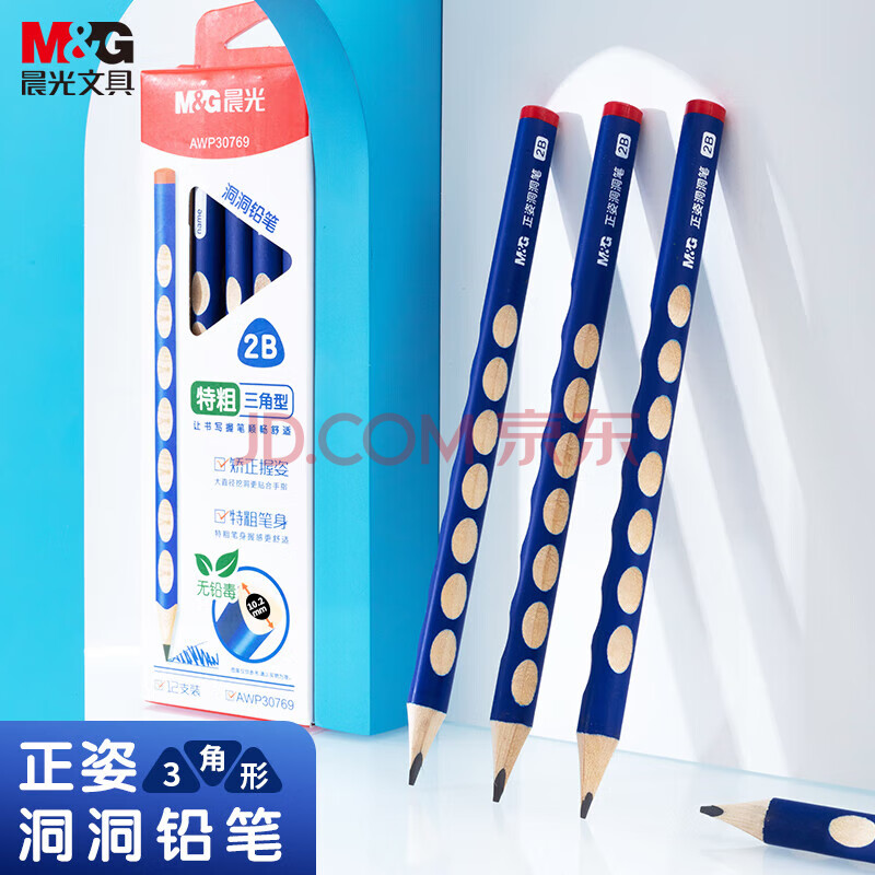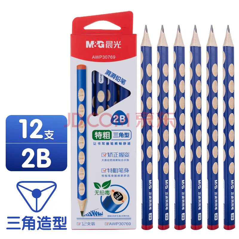 商品相册:晨光(M&G)(M&G)文具 洞洞铅笔12支2B 特粗杆易抓握 儿童正姿矫姿开学练字书写 三角木杆铅笔蓝色款AWP30769第