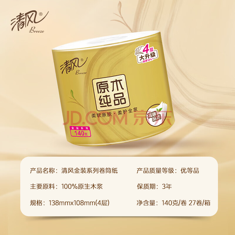 商品相册:清风有芯卷纸原木金装 4层140克*27卷 卫生纸纸巾箱装厕纸卷筒纸第