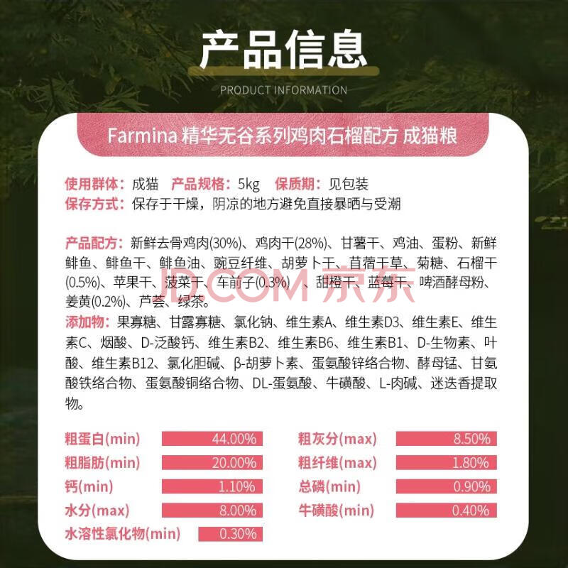 商品相册:法米娜(Farmina)进口猫粮石榴鸡肉成猫粮5kg 无谷高蛋白增重效期26/10第