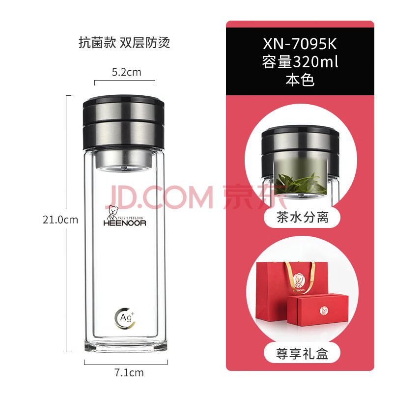 商品相册:希诺抗菌玻璃杯双层茶水分离杯子男高档泡茶杯车载水杯XN-7095K 320mL第