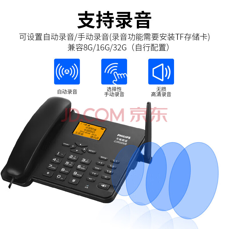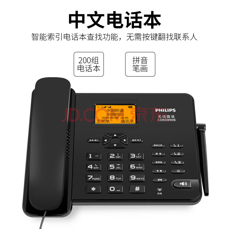 商品相册:飞利浦(PHILIPS)无线插卡电话机座机全网通4G可录音移动联通电信家用办公固话 CORD890B黑色第