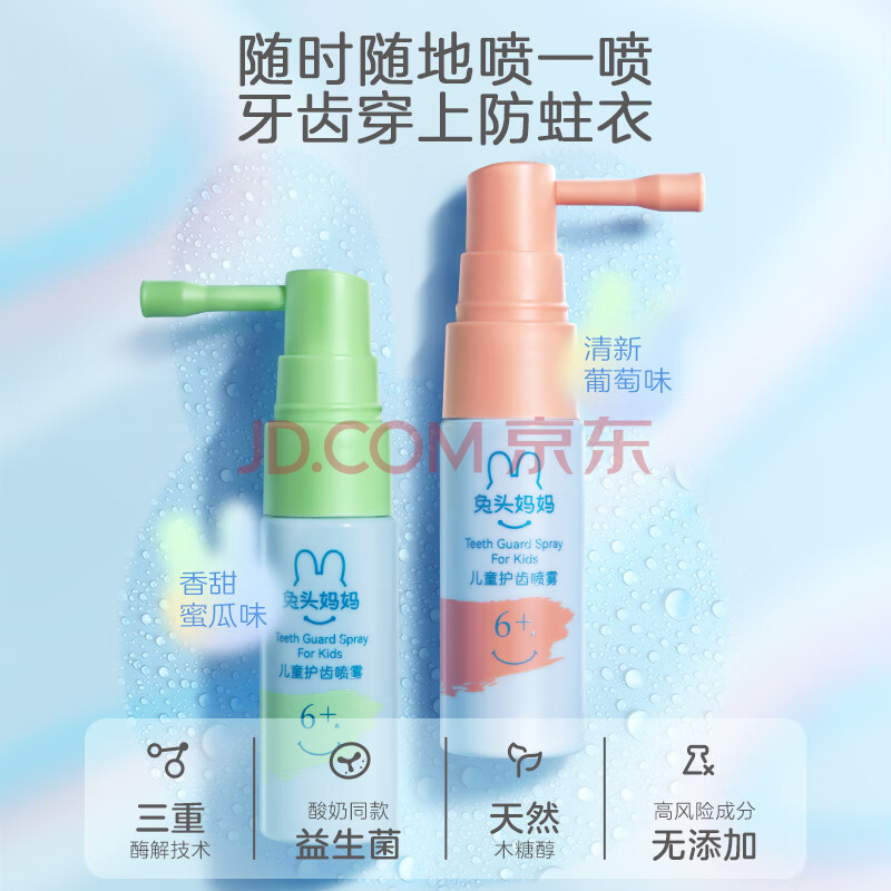 商品相册:兔头妈妈婴幼童奥拉氟低氟4件套1-3-6-12岁以上蜜桃味防蛀防龋齿牙膏+口喷第