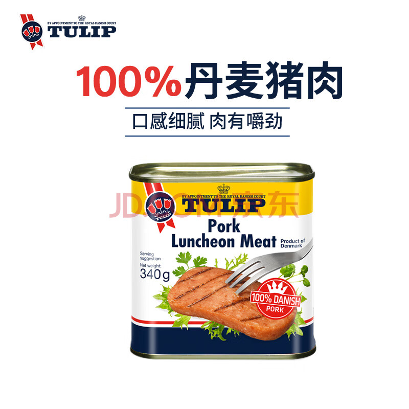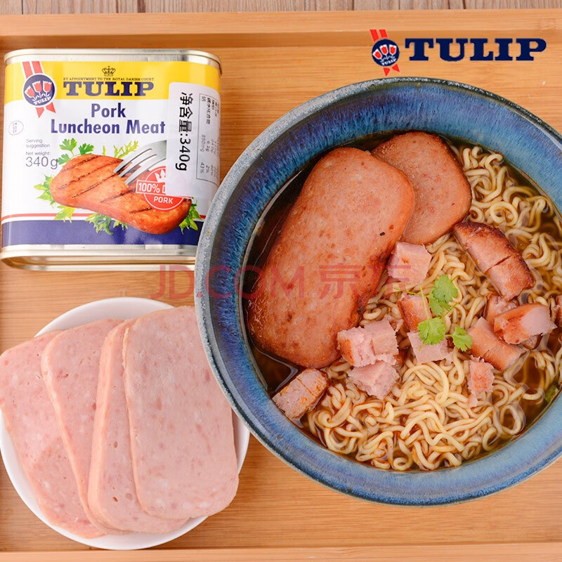 商品相册:郁金香(TULIP)丹麦进口午餐肉罐头340g即食熟食火锅早餐汉堡配菜送礼应急囤货第