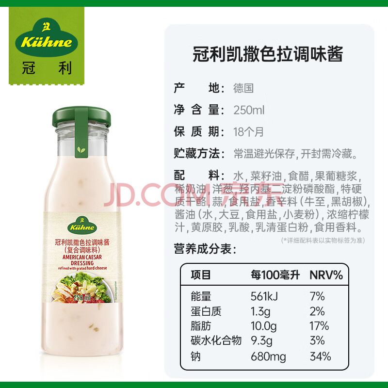 商品相册:冠利(KUHNE) 德国进口 美式凯撒沙拉酱250ml 蔬菜水果色拉酱三明治汉堡调味酱第