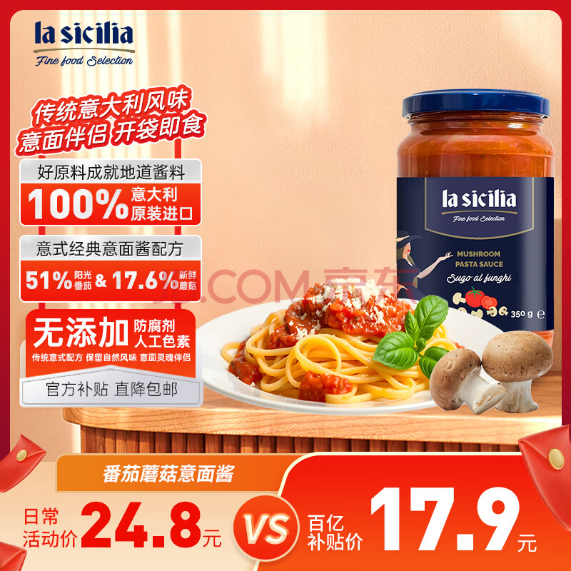 商品相册:lasicilia【进口】蘑菇番茄意面酱350g瓶 2-3人份意大利面酱披萨酱拌面卤第