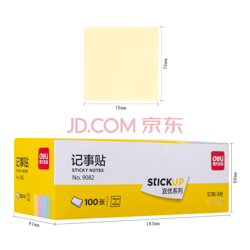 商品相册:得力(deli)12本彩色便利贴粘性便签纸 76*76mm备忘留言纸/记事贴 办公用品 9082第