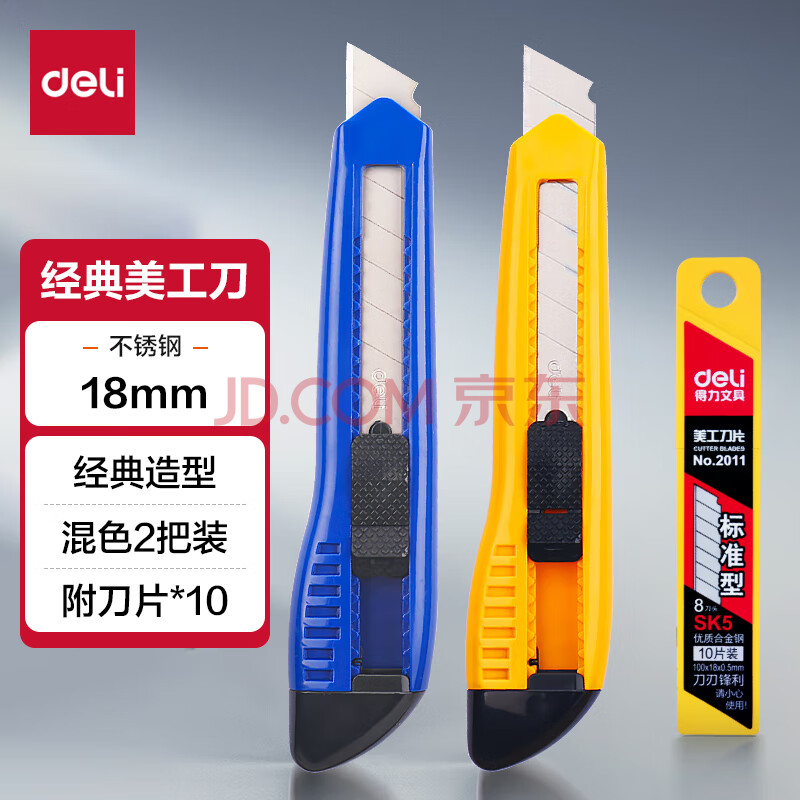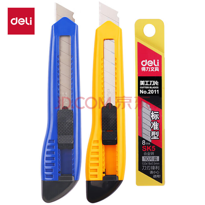 商品相册:得力(deli)大号耐用美工刀裁纸刀套装 美工刀2把快递刀10片装刀片 办公用品 33225第1张/共6