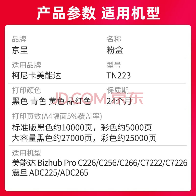 商品相册:京呈TN223适用柯尼卡美能达复印机Bizhub C226粉盒 C266 C256 C283 C0722 C7222 C7226打印机碳粉墨硒鼓 黑色标容第