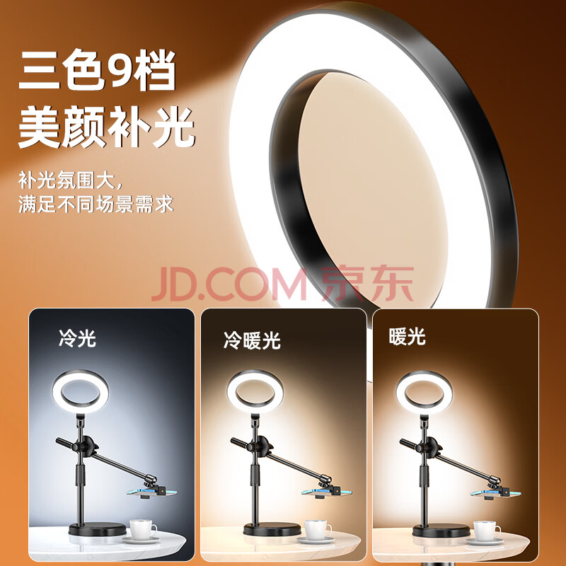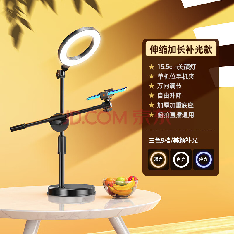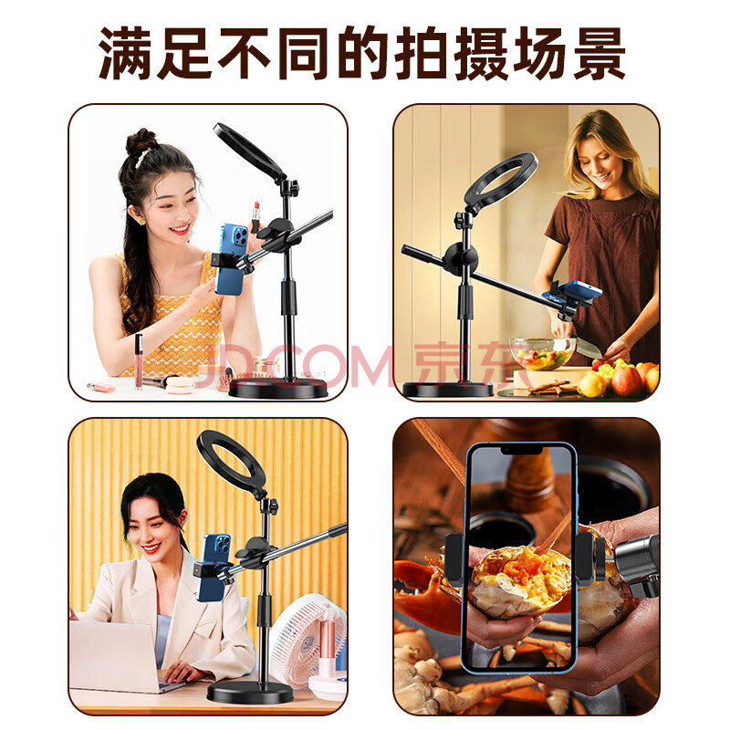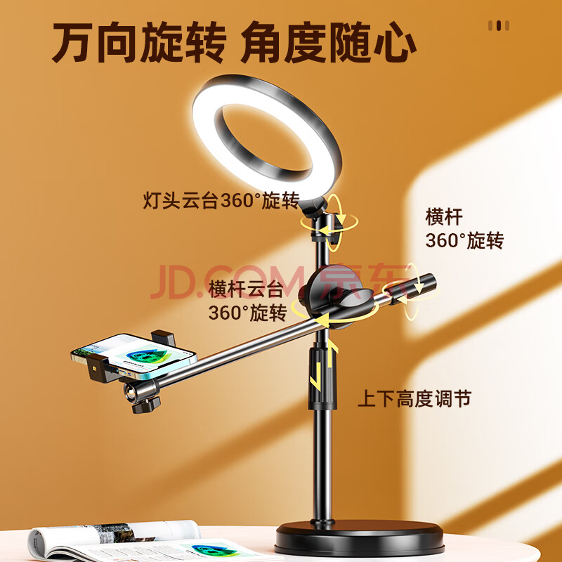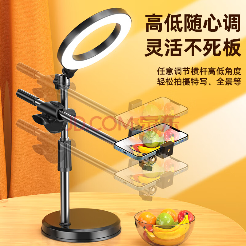 商品相册:毕亚兹【带灯款】手机俯拍支架桌面 补光美颜灯主播直播拍录视频网课美食拍摄绘画360°调节自由升降B46第
