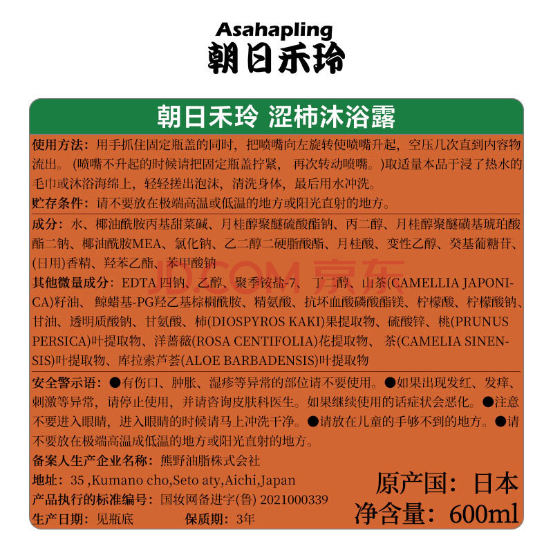 商品相册:朝日禾玲(Asahapling)日本原装进口 涩柿沐浴露600ml 富含柿单宁及玻尿酸 清洁净澈第