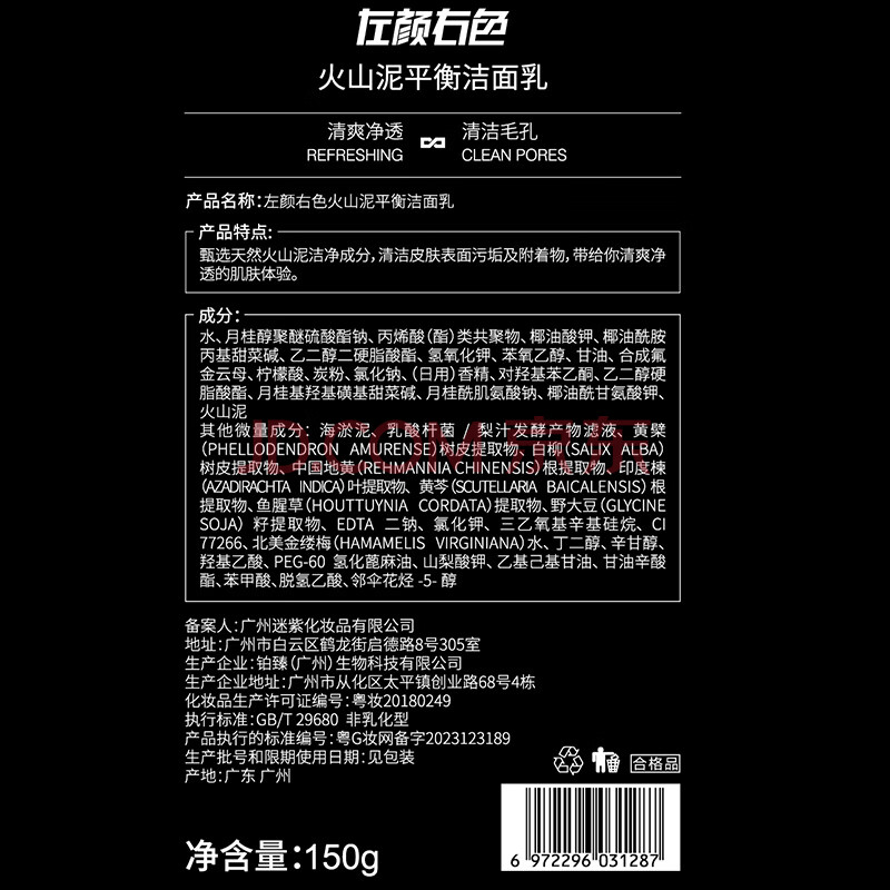 商品相册:左颜右色【郑恺代言】男士火山泥控油洗面奶去黑头清爽净澈控油洁面乳150g第