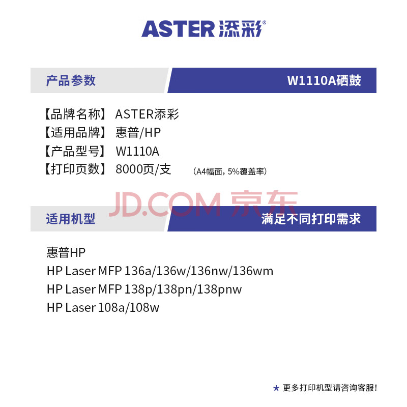 商品相册:添彩110a硒鼓 适用惠普136w硒鼓带芯片w1110a硒鼓hp mfp 136nw 136a 108W 108a 138pw打印机墨盒大容量第