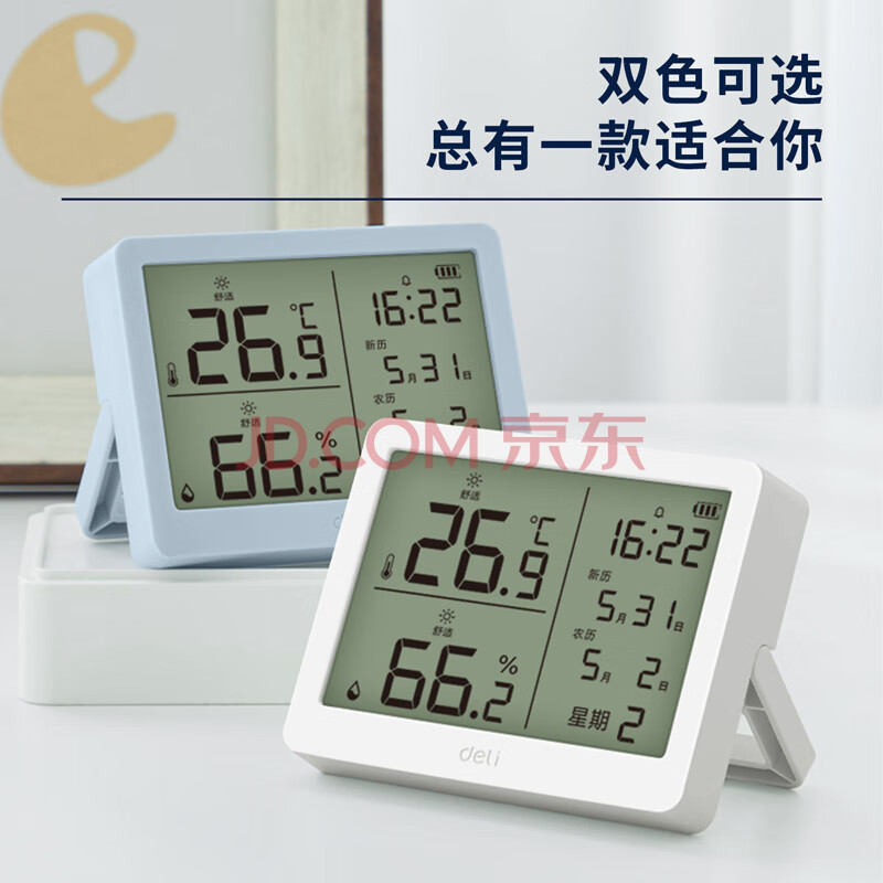 商品相册:得力(deli)室内温湿度表 LCD\电子温湿度计老人儿童礼物生日礼品带闹钟功能 婴儿房办公用品 蓝色LE502-TQ第