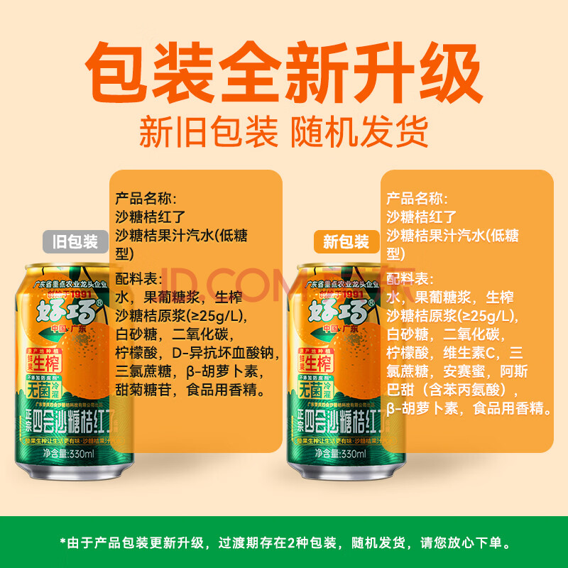 商品相册:好巧四会特产沙糖桔生榨果汁型汽水碳酸饮料整箱330ml*24罐第