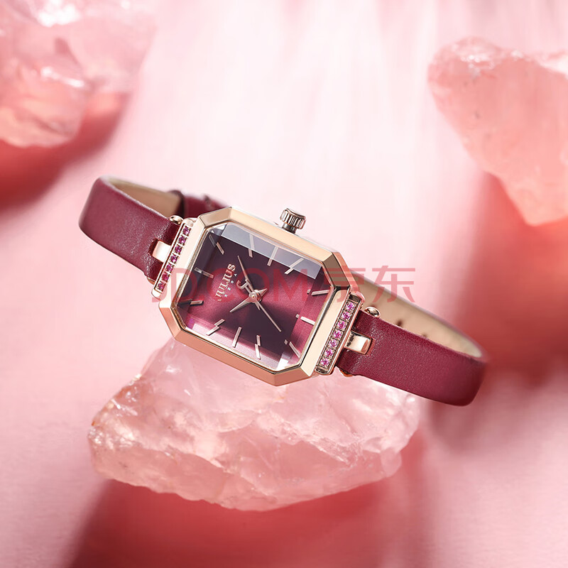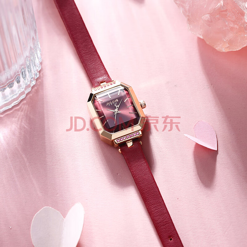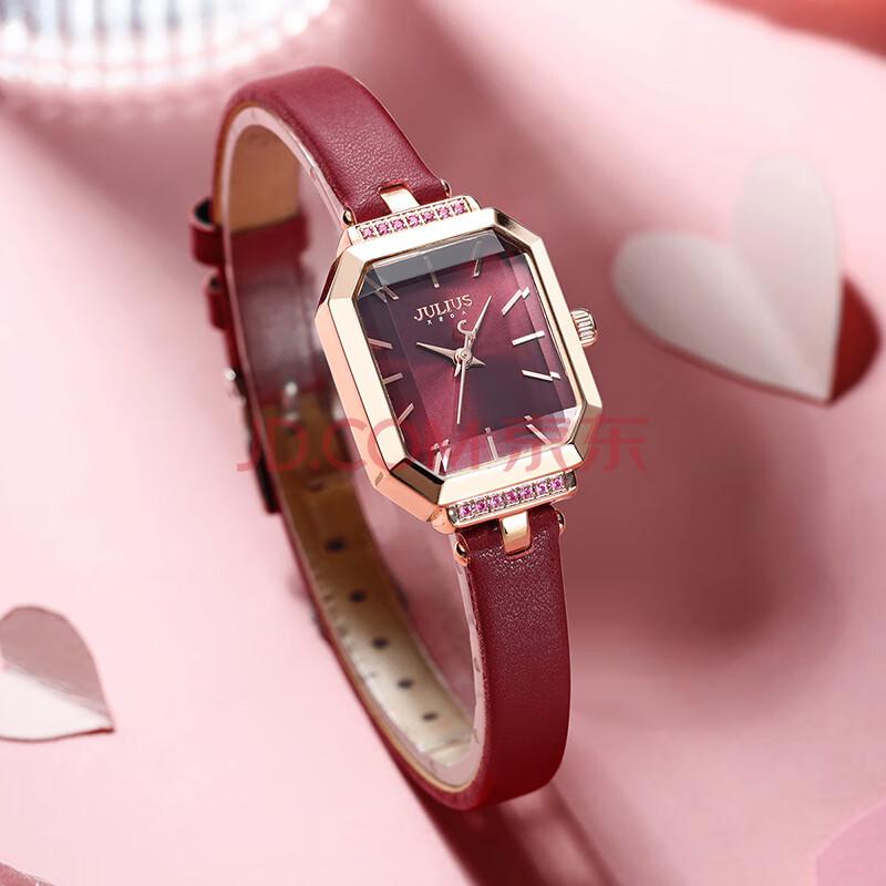 商品相册:聚利时(Julius)手表女优雅百搭复古方形皮带时尚女士防水石英手表酒红色JA-1064F第