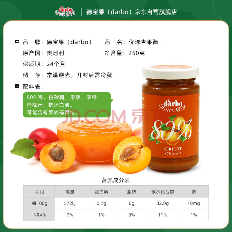 商品相册:DARBO 优选杏果酱250g/瓶 80%果肉含量早餐下午茶面包酸奶 奥地利进口第