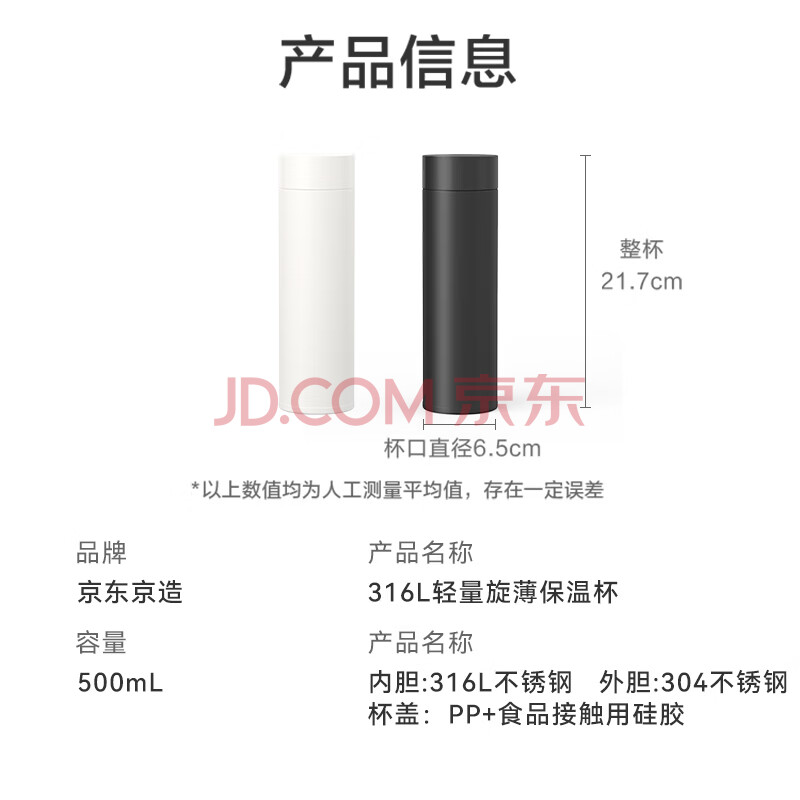 商品相册:京东京造 保温杯 水杯男士女儿童咖啡 316L不锈钢【无缝内胆】白500ml第