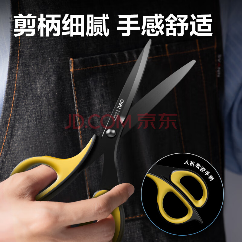 商品相册:得力(deli)210mm人机造型黑刃防锈剪刀 办公家用生活手工剪纸刀 办公用品 灰色77757第