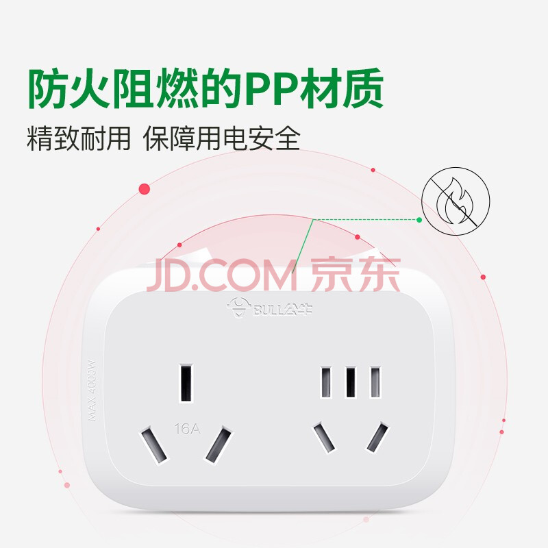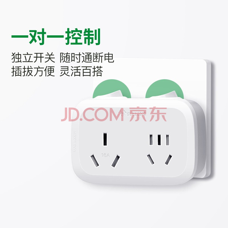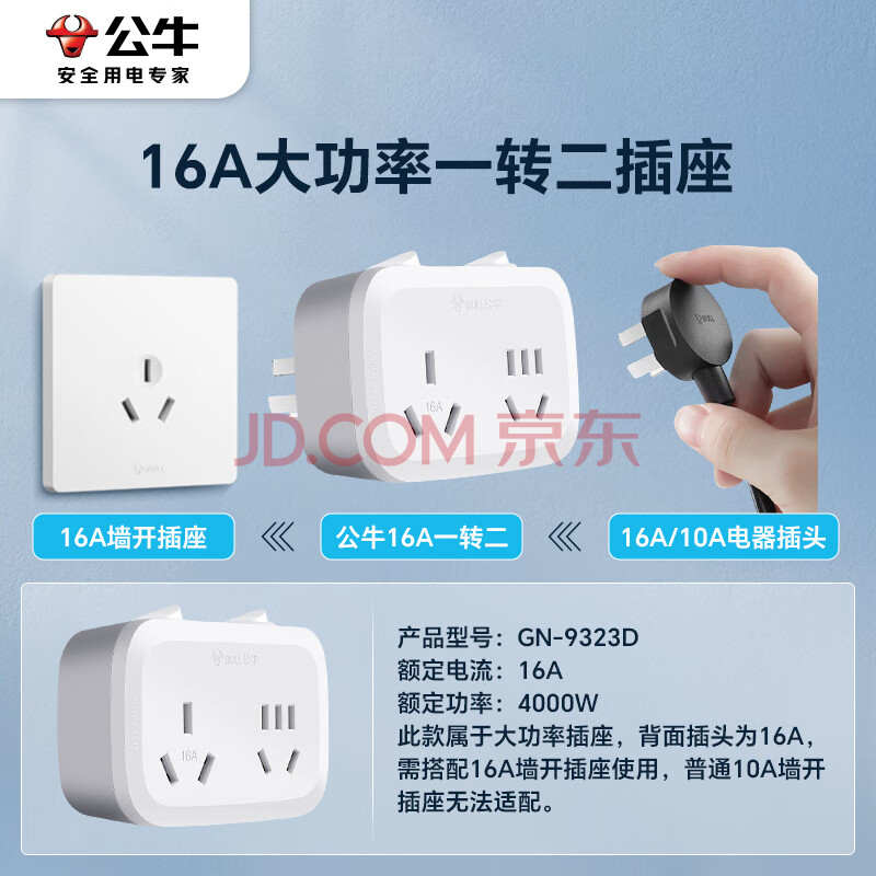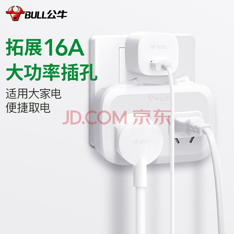 商品相册:公牛(BULL)16a大功率一转二/16a转10a一转多插座扩展器/转换插头/插排 适用空调、热水器 2位分控GN-9323D第