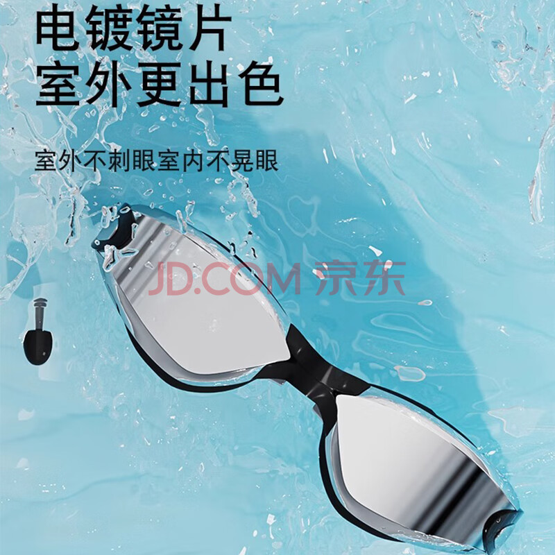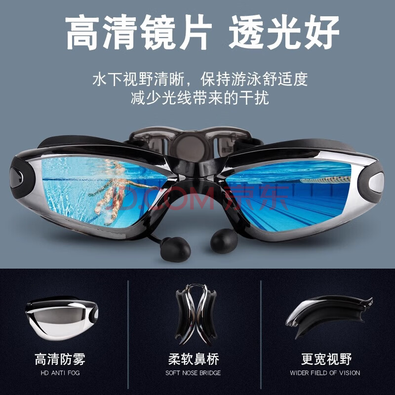 商品相册:佑游泳镜泳帽高清防雾防水耳塞鼻夹眼镜泳镜五件套Z6615 电镀黑色平光第