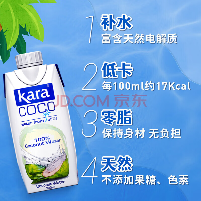 商品相册:KARA100%椰子水330ml*12瓶 含电解质 快速补水饮料0脂低卡第